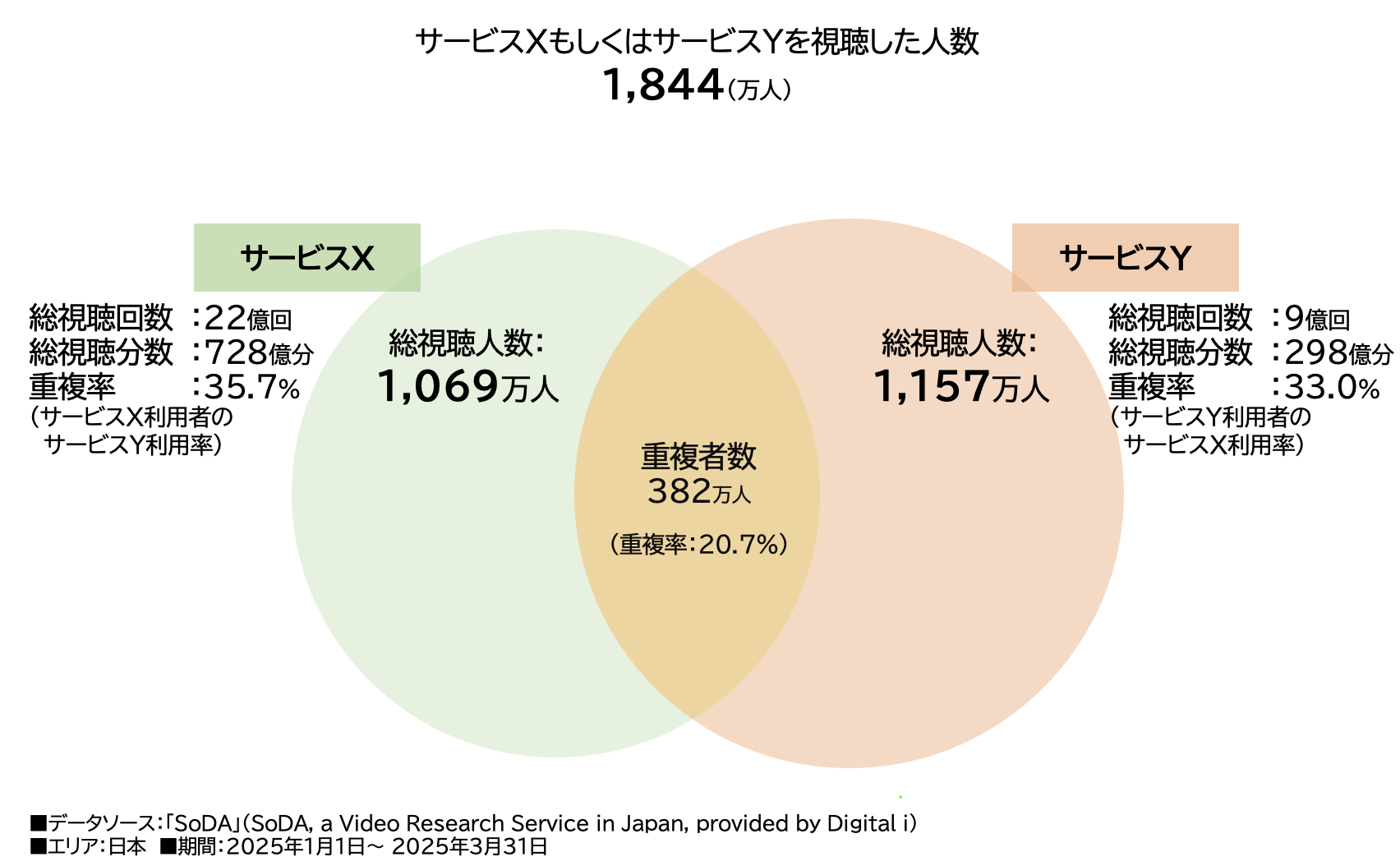 総視聴人数は、サービスXが1,069万人、サービスYが1,157万人で、今回の計測期間ではサービスYの方が多くの利用者を獲得しています。利用者の重複率を見ると、サービスX利用者の36%がサービスYも利用し、サービスY利用者の33%がサービスXも利用しています。互いに3分の1程度の人が重複利用している状況です。そして、いずれかのサービス利用者(1,844万人)のうち、両サービスを併用している人は21%でした。両サービス併用者は一定数存在しますが、限定的であるといえます。