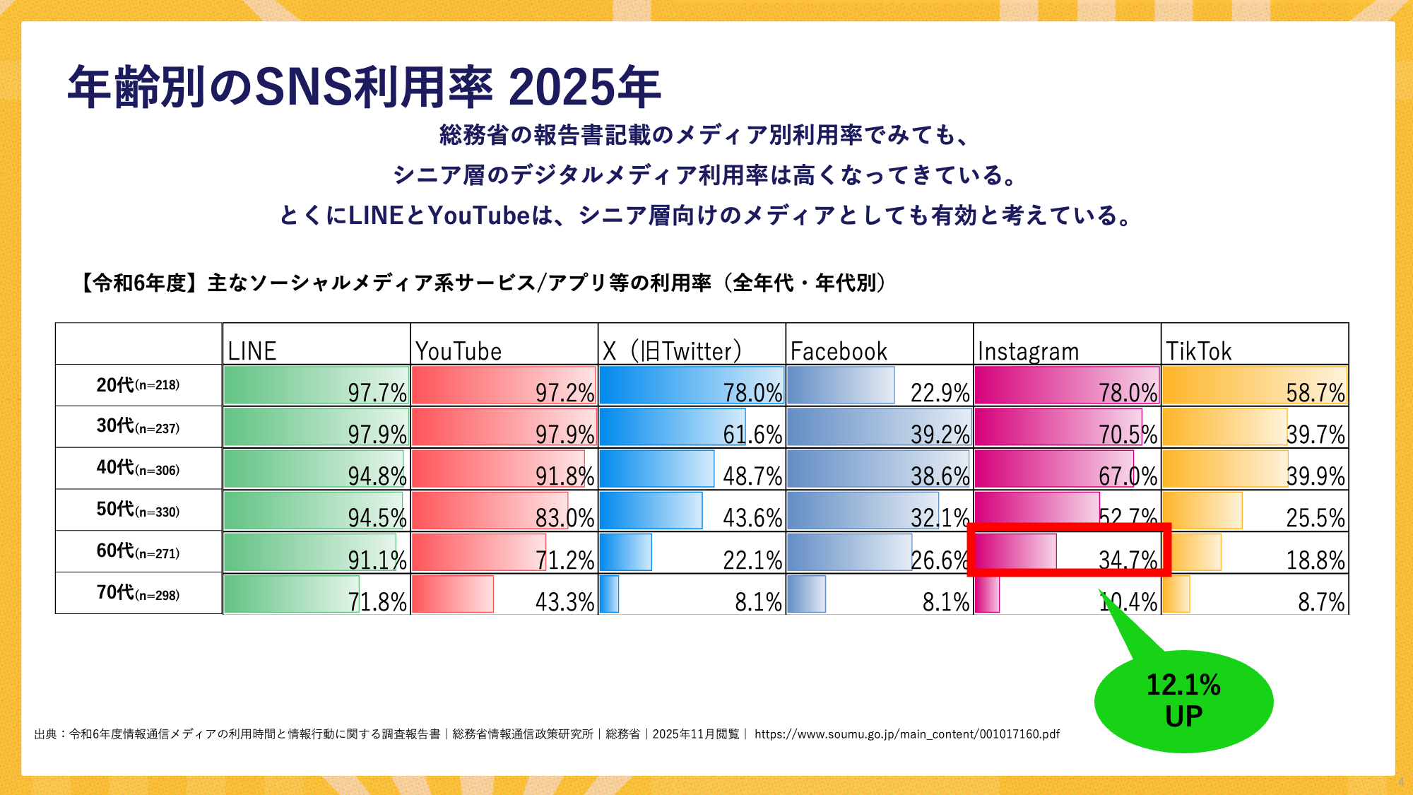 LINEやYouTubeといった主要プラットフォームが世代を問わず普及するなか、Instagramも60代の約3人に1人が利用するメディアにし、「若者のSNS」という従来のイメージは薄れつつあります。